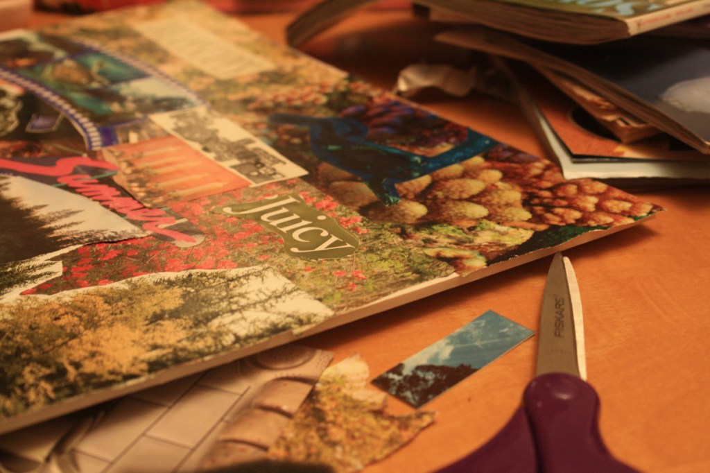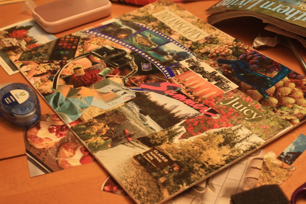• One of my favorite parts of making vision boards is getting to release my inner child with cutting and pasting pictures and words in a collage format. You do not need many materials to get started, all you need is a board or piece of paper, a couple magazines you can pull inspiration from, scissors, and a glue stick. Of course, you also need your creative thinking. The bare bones of making a board is quite simple, once you gather these items, you are already 90% there.