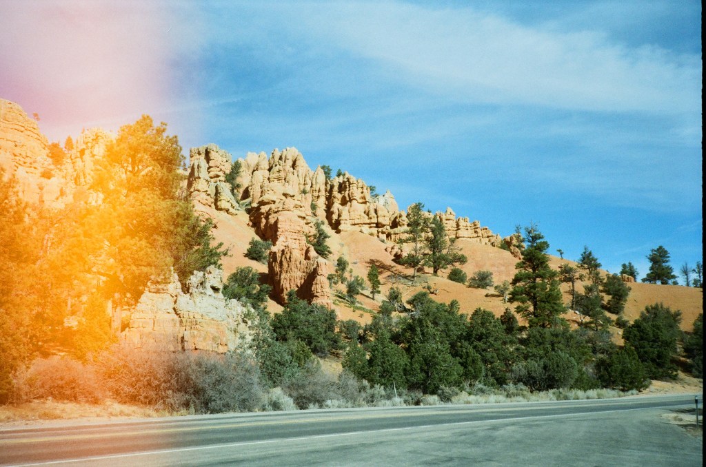 The drive from Springdale to Bryce was a scenic one, winding through small towns and past dramatic buttes and mountains. As we neared Red Canyon, part of Dixie National Forest, we made a quick stop to take photos of the stunning landscapes. The road then led us through a colorful stretch that teased us with views of what was to come.