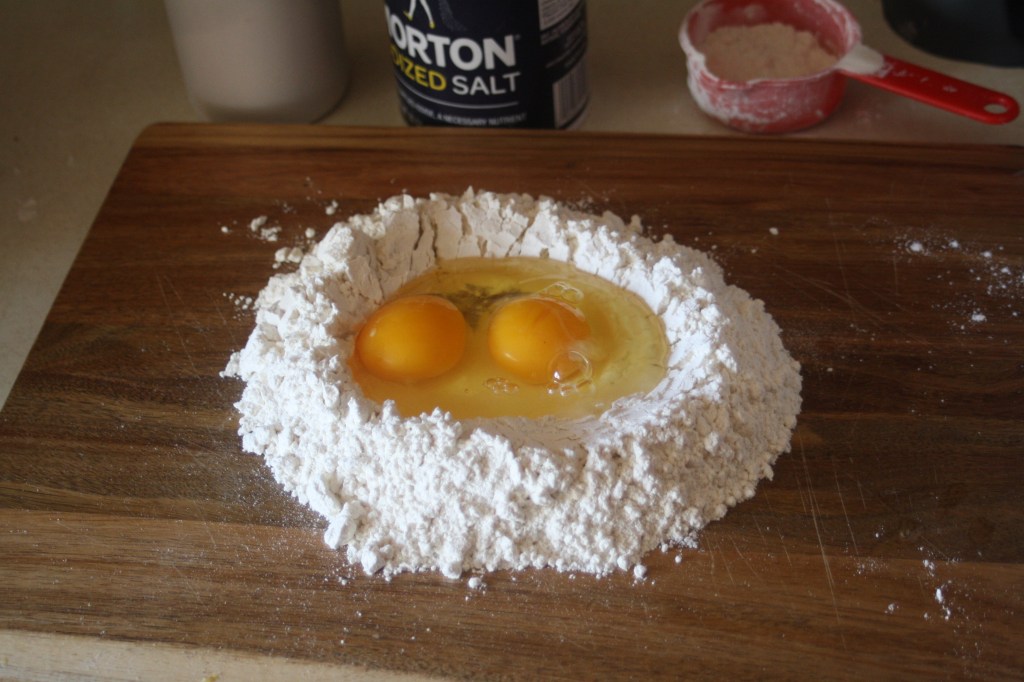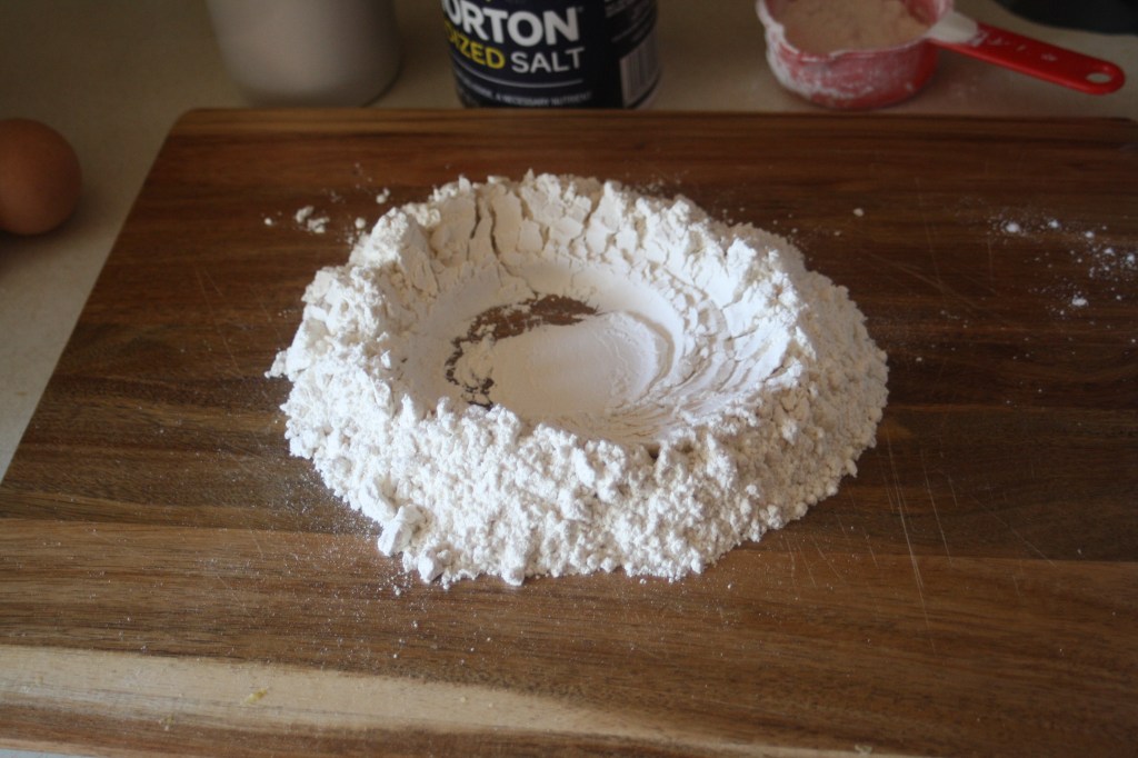 - Prepare the flour: On a clean, flat surface (like a cutting board), mound 1 cup of flour. Use the measuring cup or your hands to create a well in the center of the flour.