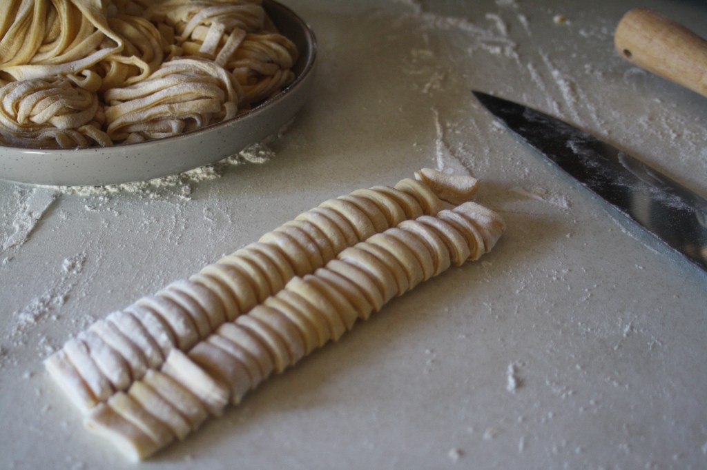 - Cut the pasta: Once you’ve rolled the dough out to your desired thickness, use a knife or pasta cutter to slice it into your preferred pasta shape (like fettuccine or tagliatelle).