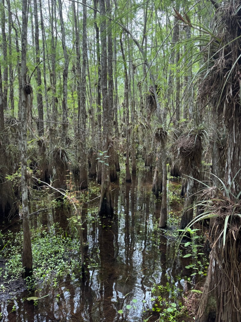 Once we entered the Cypress Dome, this is when the wet walk went from great to spectacular. It felt as if we were on another planet being surrounded by these huge trees with impressive roots. We wove through the Cypress trees continued to be in awe about our surroundings.