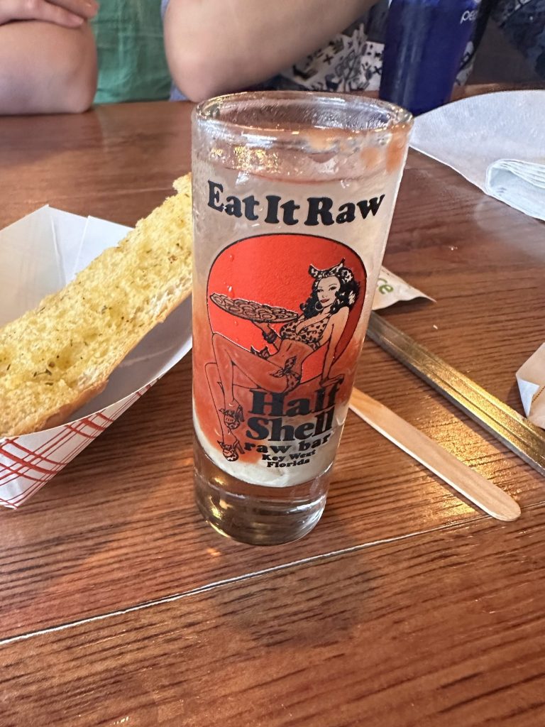 One item on the menu immediately caught my eye — the Oyster Shooter. It promised a souvenir shot glass, but with a catch: the shot itself was a bold mix of jalapeño vodka, cocktail sauce, and a whole oyster. Intrigued by the challenge (and tempted by the keepsake), I decided to go for it — a strange little adventure in a glass, with a souvenir to prove it.
