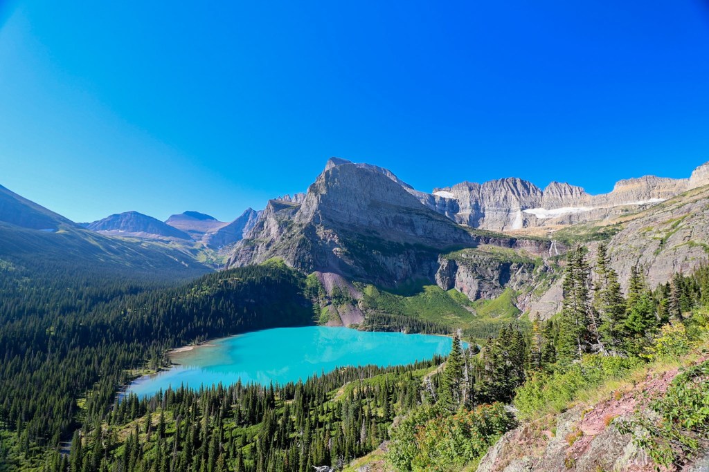 Gradually, Grinnell Lake revealed itself below, its glacially milky turquoise waters gleaming with the same mesmerizing vibrance found in photos. From that vantage point, flanked by towering ridges and framed by cascading waterfalls, the lake looked surreal and almost too perfect to be real.