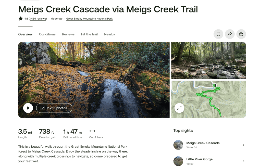 At three and a half miles with just over 700 feet of elevation gain, the hike strikes a nice balance—short enough for a quick outing but with enough challenge to keep things interesting. Creek crossings along the way add a fun, technical element. The trail itself is part of the larger Meigs Creek Trail, which can be extended if you’re up for continuing on to Meigs Mountain.