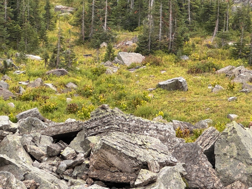 Once you move past the more exposed section, the trail settles into a gentler rhythm as it winds through pockets of pine and fir. You continue trekking along the mountainside, the forest opening and closing around you like a curtain.