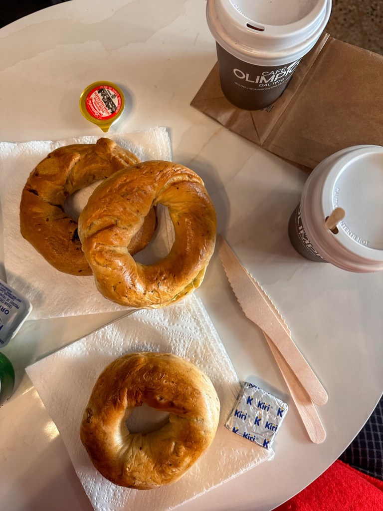 We carried our bagels a few steps down the street to Café Olympico, the perfect spot to pair them with a good cup of coffee. To give our taste test some range, we picked up a Rosemary & Sea Salt, a Maple Apple, and a classic Plain bagel. A pair of lattes rounded out our breakfast lineup, and we settled into the lively café atmosphere, happily eating and sipping as the morning buzzed around us.