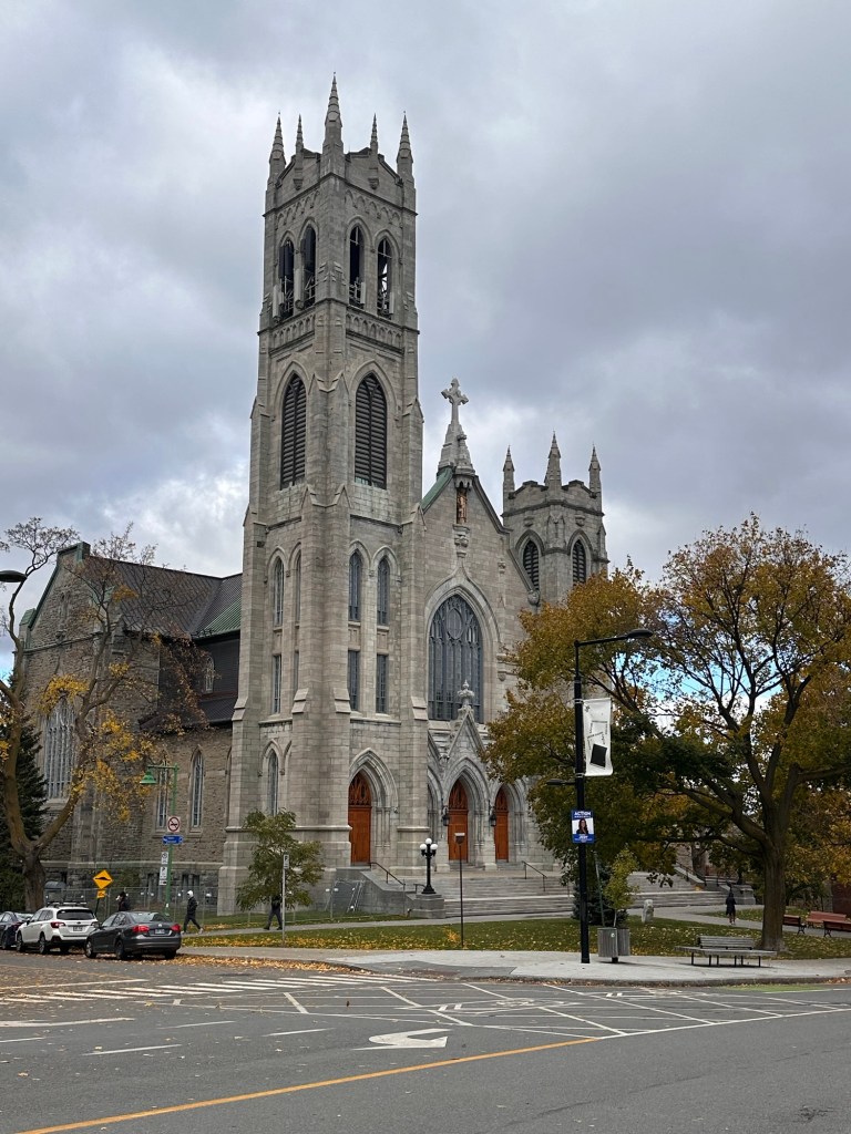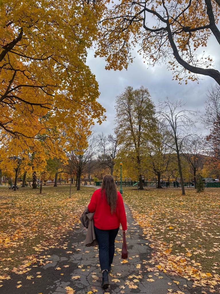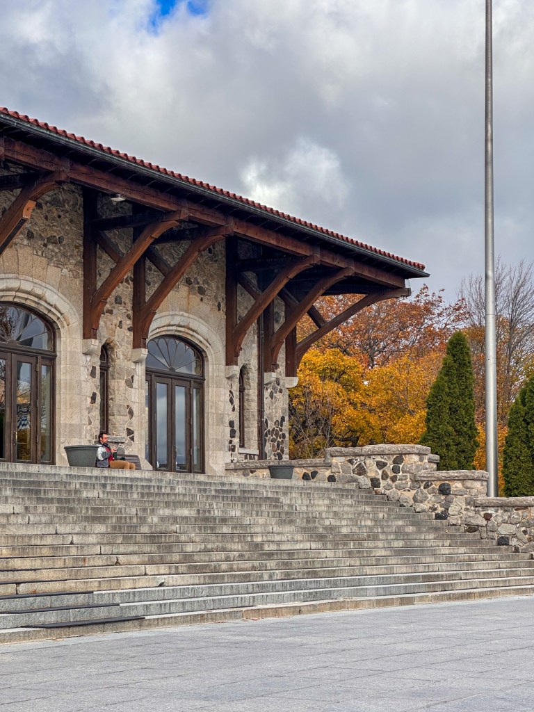 The park’s wide walking trails and winding paths made it easy to wander at a relaxed pace, taking in both the natural scenery and the glimpses of the city beyond the trees. We spent about an hour meandering through the park, snapping photos, and soaking up the calm atmosphere. After pausing at a few overlooks, we eventually made our way to Mount Royal Chalet—a beautiful building with sweeping windows, ornate details, and a postcard‑worthy view.
