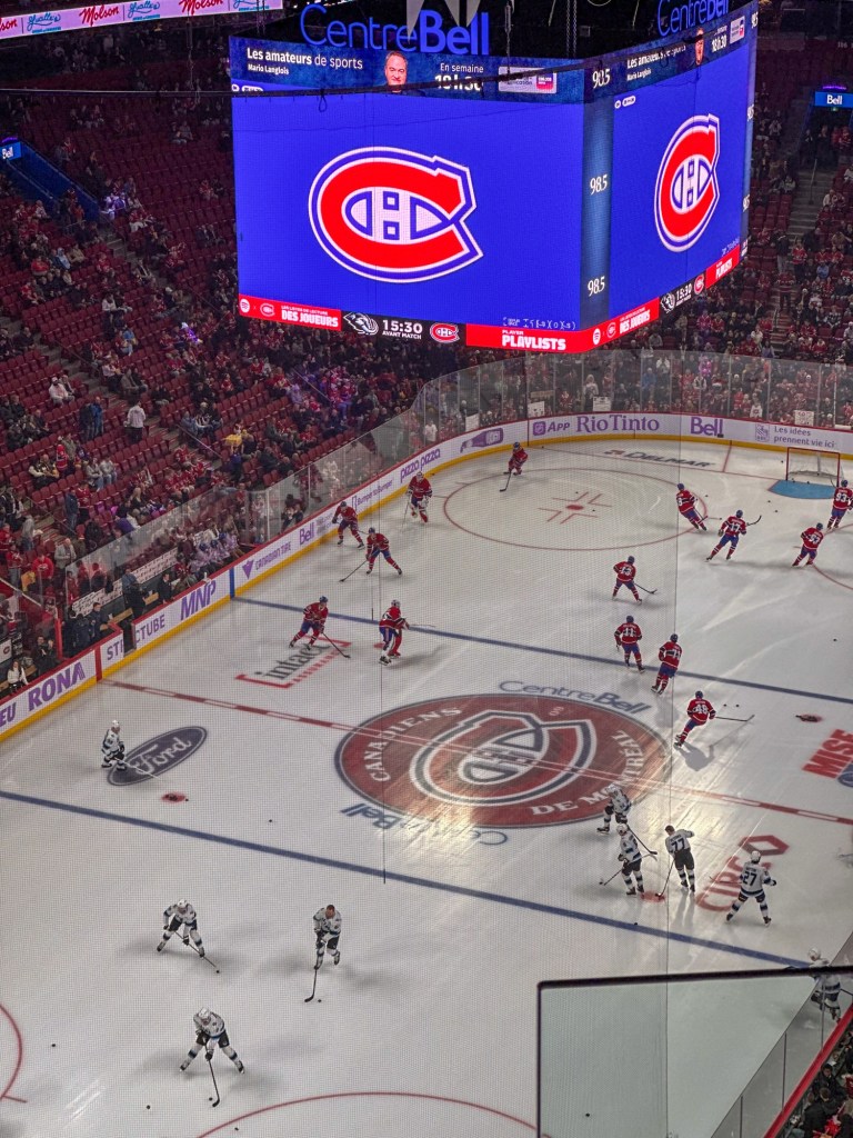 We settled into our seats and immediately took in the incredible view of the rink below. The energy was electric from the moment the players hit the ice—fans cheering, music thumping, and the kind of collective excitement that makes you feel like part of something bigger. We even made friends with the people sitting next to us and grabbed some poutine to fully embrace the experience. As the arena filled, the atmosphere only grew more intense, especially when the Canadiens snagged an early lead.